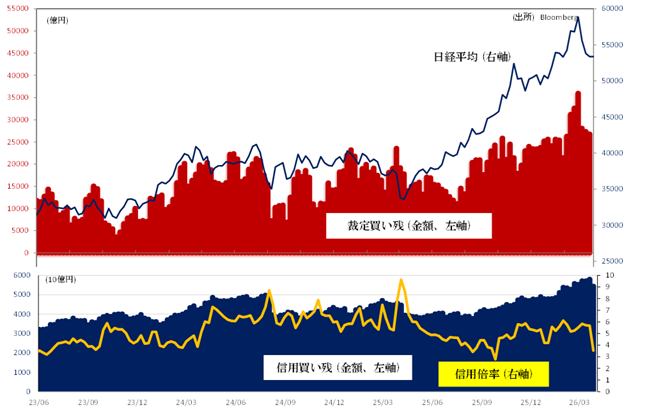 3月27日時点の信用買い残は5兆4441億円でした。前週の5兆8025億円(20年ぶり高水準)からは減少しましたが、依然として記録的な大きさです。ちなみにデータ遡及可能な2005年以降の過去最高水準は5兆9836億円(2006年2月10日)です。