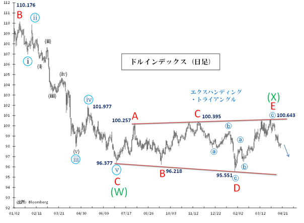 足元では50週MAを割り込む動きとなっています。今週末時点で50週MA(98.606)割れが確認されれば、3月31日に付けた高値(100.643) を以て(X)波が完了し、持続的なドル安トレンドがスタートした可能性が高まります。