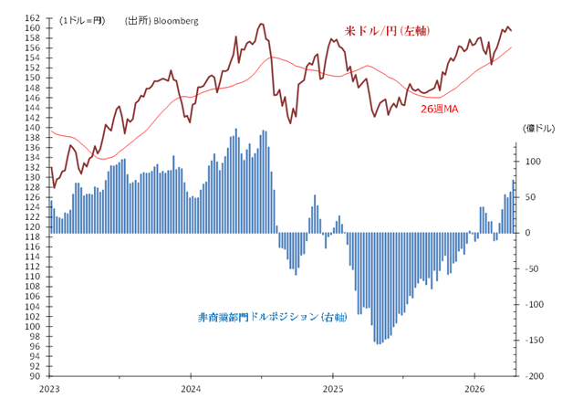 IMM通貨先物市場において、投機筋(非商業部門)の円売り持ちは、前週の57.4億ドルから73.5億ドルへ拡大しました。円の売り持ち高は24年7月以来の大きさになりました。