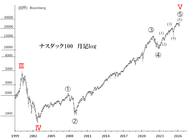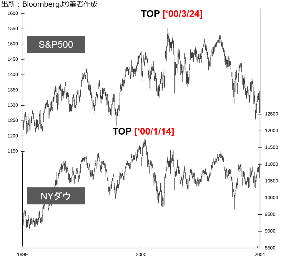 当時、世界中が懸念していた「2000年問題」を無難に通過したことで安心感が広がり(イラン戦争停戦で安堵している今の状況に似ています)、NYダウは2000年1月14日に当時の最高値を付けました。その後も止まらないドットコム関連株の上昇により(AI関連株の上昇を彷彿させます)、3月24日にはS&P500とナスダック100が最高値を記録しました。