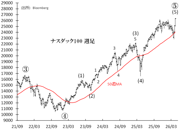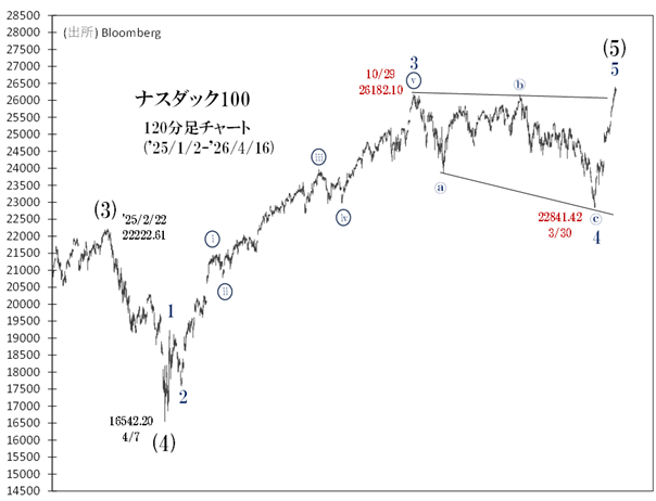 第(5)波中の第1波と第5波が、同じ上昇率(16.27%)になる水準を計算すると、第5波の上値メドは[26,557]です。これは4月16日高値(26,400)から至近の節目です。