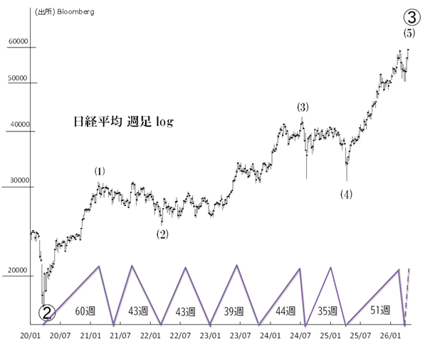 昨年4月以来のプライマリー第➄波のラリーでは第3波が延長しました。このようなとき、第1波と第5波の上昇幅は等しくなる傾向があり、ここからすると第5波は[60,618円]へ上伸する可能性があります。