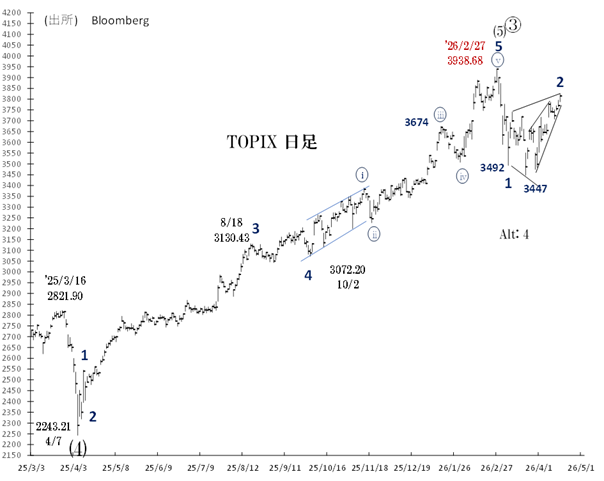 ただしTOPIXが高値を更新すれば上記の見方はキャンセルされます。この場合、足元の上昇を第5波と読み換えます。