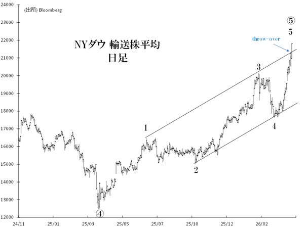 ダウ輸送株平均は、25年4月来のインパルス波の最終上昇・第5波にあります。足元でみられる「スローオーバー」は、1年続いたラリーが最終局面にあることを暗示しています。