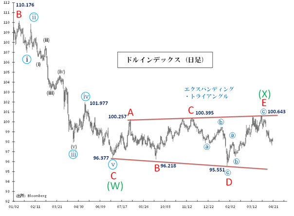 50週MA割れの確認は、3月31日に付けた高値(100.643) を以て(X)波が完了し、持続的なドル安トレンド入りの可能性を高めています。