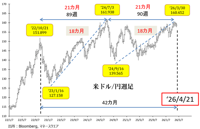 4月20日のエリオットViewで解説したように、3月末から4月にかけて、21カ月・89週(フィボナッチ数)、18カ月(17+1)・42カ月(基本数値)の合致がみられます。足元で重要なターニングポイントを迎えており、米ドル/円のトレンドが転換する可能性に注目です。