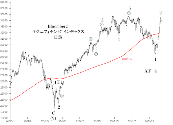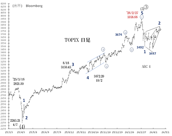 なおTOPIXが高値を更新すると、その時点で上記の見方はキャンセルされ、足元の上昇を第5波と読み換えます。