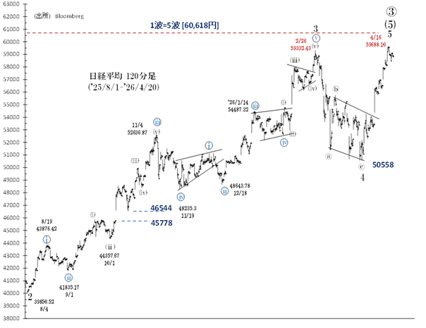 50,558円(3/31安値)以来、マイナー級第5波による上昇が進行しているとみられます。