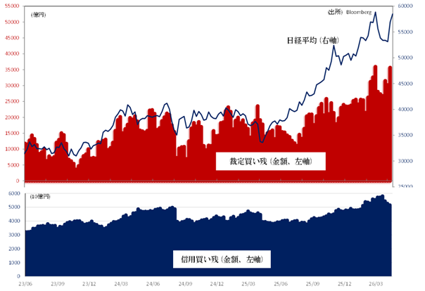 ひとたび相場が逆回転を始めると、大量の買い残に対する巻き戻しの売りが誘発されかねません。4月10日時点で、信用買い残(5兆1565億円)、裁定買い残(3兆7192億円)、いずれも記録的高水準が続いています。