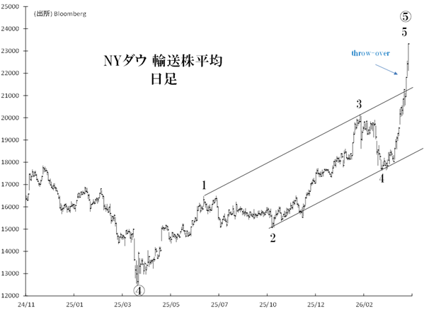 ダウ輸送株平均は、25年4月来のインパルス波の最終上昇・第5波にあります。足元でみられる「スローオーバー」は、1年続いたラリーが最終局面にあることを暗示しています。