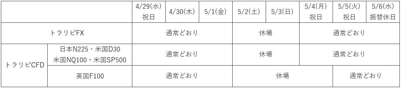 ゴールデンウィーク期間中(4/29~5/6)のトラリピFX/CFD取引や入出金、お問い合わせ窓口の営業状況等についてご案内いたします。