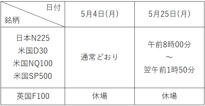 2026年5月中のトラリピCFDの取引時間について以下の変更が予定されておりますのでお知らせいたします。