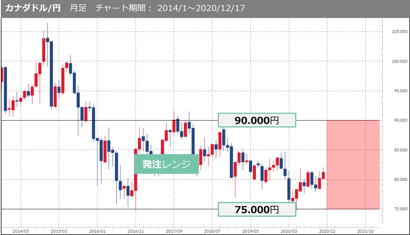 2021年のカナダドル/円は75.000~90.000円のレンジを想定しています。75.000円は2020年4月と5月の安値近辺、90.000円は2018年10月の高値近辺です。
